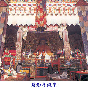 薩迦派也被稱為「花教」,據說是薩迦寺院的圍牆上塗有紅、白、藍三色條紋的緣故。初祖貢噶寧布是成就喜金剛的;而喜金剛的三面,是中藍、左紅、右白,他為處處不忘本尊,所以用這三種顏色塗繪在寺廟外。 |