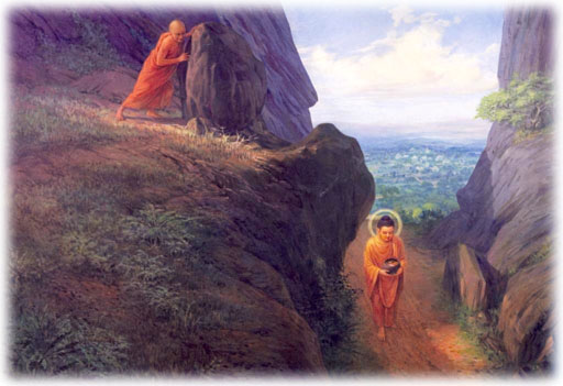 佛陀對舍利弗說:「你可知當時的須檀長者是誰嗎? 他就是我今生的父王淨飯王(又名真淨王);當時的須摩提,就是我的前身;弟弟修耶舍則是今日的提婆達多。我當時因貪財謀害弟弟,以此罪業故,於無數千歲,墮入地獄中飽受燒煮、鐵山所錐之痛苦。直到今日,我雖已成佛,貴為三界至尊,仍因當時所剩餘的殘緣惡業,無法避免今生要遭受的災厄,必須親身償還宿債。我於山上經行的時候,提婆達多躲在附近不遠的陰暗處,舉起崖石,朝我的頭部丟擲。所幸是山中的山神在暗中守護著我,接住落下之崖石,但崖石邊緣的小石頭飛脫彈出,並擊中我腳上的拇指,以致流血。」